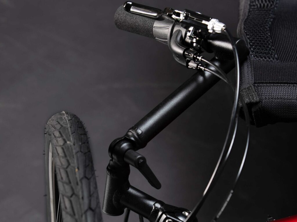 The Traveler handlebars feature a quick release hinge and fold down for traveling.